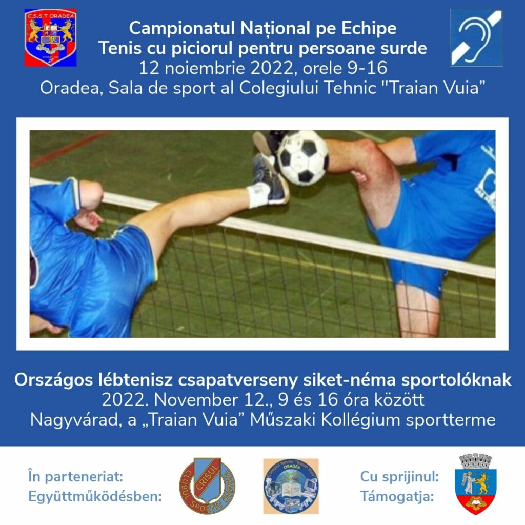 Sâmbătă, 12 noiembrie între orele 9-16 se va desfășura Campionatul Național pe Echipe tenis cu piciorul pentru persoane surde, la Sala de sport a Colegiului Tehnic „Traian Vuia” Oradea, organizat de Clubul Sportiv „Tăcerea”, în parteneriat cu Clubul Sportiv Crișul și Colegiul Tehnic „Traian Vuia „, cu sprijinul de specialitate al domnului Gheorghe Grădinaru, fiind un proiect susținut de Primăria Municipiului Oradea.