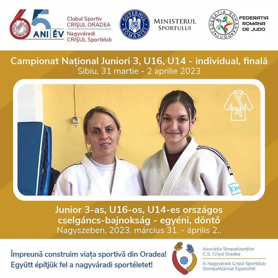 Campionatul Național Juniori 3, U16, U14 ce se va desfășura la Sibiu, sub egida Federației Române de Judo. Delegația clubului nostru este compusă din doamna antrenor Ianc Olimpia, respectiv Federeac Sofia sportiv.