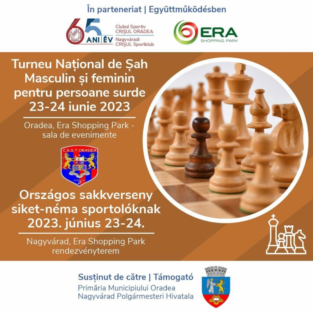 Clubul Sportiv al Surzilor Tăcerea (președinte Todor Viorel), în parteneriat cu Clubul Sportiv Crișul Oradea și Era Shopping Park Oradea, cu sprijinul Primăriei Municipiului Oradea, organizează în perioada 23-24 iunie a.c. ♟️Turneul Național de Șah pentru persoane surde, atât pentru categoriile de masculin cât și feminin. Competiția se va desfășura la sala de evenimente din complexul Era Shopping Park, intrarea fiind liberă, după următorul program: