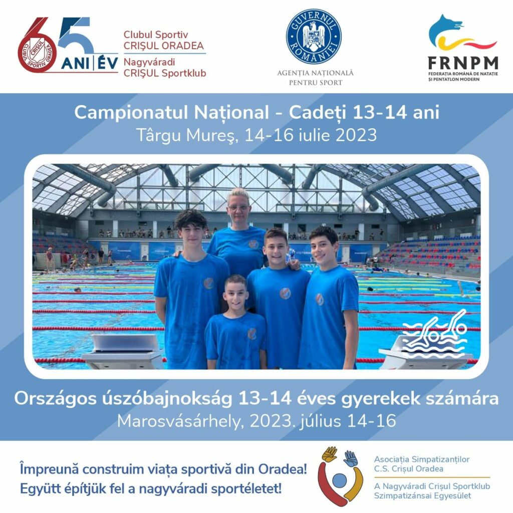 Július 14. és 16. között Marosvásárhelyen szervezik meg az Országos Úszóbajnokságot 13 és 14 éves gyerekek számára. A Nagyváradi Crișul Sportklub a következő sportolókkal képviselteti magát: Székely Antonio (önkéntes edző: Ovidiu Tirla), Varga Dominik, Tasyürek Denis és Sabău Ciprian (edző: Madău Cristina).