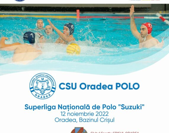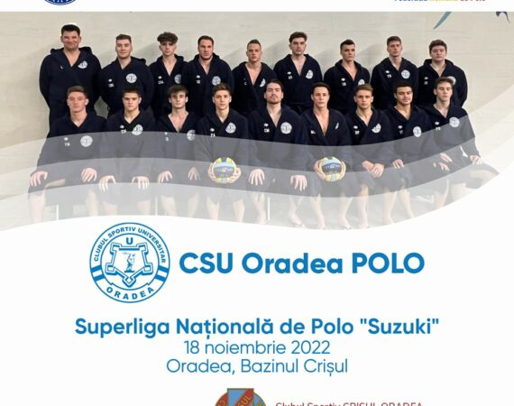 Superliga Națională de Polo "Suzuki" Etapa 7, retur 18 noiembrie 2022 Bazinul CRIŞUL 19.00: CSU Oradea Sportul Studențesc București Componenții echipei 1. Abrudan Șerban2. Terean Sergiu3. Turculeț Daniel4. Chioveanu Mihnea5. Costa Maximilian6. Codilă Bogdan7. Dumitru Patrick8. Insinna Tommaso9. Cărăman Luca10. Szilágyi Erik11. Haşaş Roland12. Păşcăluță Adrian13. Șandru Raul14. Fitero Mihai15....