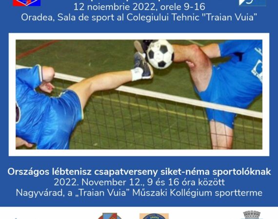| Sâmbătă, 12 noiembrie între orele 9-16 se va desfășura Campionatul Național pe Echipe tenis cu piciorul pentru persoane surde, la Sala de sport a Colegiului Tehnic "Traian Vuia" Oradea, organizat de Clubul Sportiv "Tăcerea", în parteneriat cu Clubul Sportiv Crișul și Colegiul Tehnic "Traian Vuia ", cu sprijinul de...