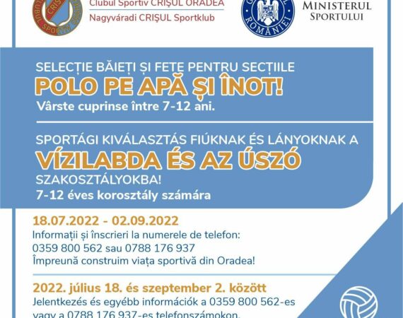 | Stagiu de selecție: polo pe apă şi înot băieți şi fete, cu vârste cuprinse între 7-12 ani, 18.07.2022-02.09.2022, bazinul Crișul Informații și înscrieri la numerele de telefon: Illés Zsolt (0740 295 223) antrenor înot Oana Vidican (0740 984 709) instructor polo feminin Alex Ihoș (0770 103 290) instructor polo...