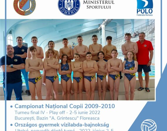 | Începând de joi 02.06.2022 la Bazinul "A. Grințescu" din Bucureşti va avea loc turneul final IV - PLAY OFF al Campionatului Naţional de Copii. Programul meciurilor echipei noastre Joi, 2 iunie:Corona Braşov CRIŞUL ORADEAAmefa Arad CRIȘUL ORADEA Vineri, 3 iunie:CRIŞUL ORADEA CSA Steaua BucureştiWings CRIȘUL ORADEA Sâmbătă, 4 iunie:CRIŞUL...