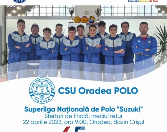 Superliga Națională de Polo "Suzuki", sferturi de finală, meciul retur. Sâmbătă, 22 aprilie 2023:9.00: CSU Oradea CS Rapid Bucureşti Componenții echipei 1. Abrudan Șerban2. Terean Sergiu3. Turculeț Daniel4. Chioveanu Mihnea5. Costa Maximilian6. Codilă Bogdan7. Dumitru Patrick8. Insinna Tommaso9. Cărăman Luca10. Csató Balázs11. Haşaş Roland12. Păşcăluță Adrian13. Șandru Raul14. Fitero Mihai15....