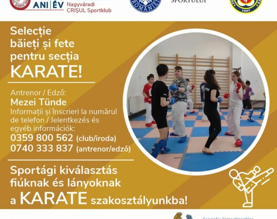 | SELECȚIE BĂIEȚI ȘI FETE PENTRU SECȚIA KARATE!Antrenor: Mezei Tünde Informații și înscrieri la numerele de telefon: 0359 800 562 (club) sau 0740 333 837 (antrenor) Împreună construim viața sportivă din Oradea! SPORTÁGI KIVÁLASZTÁS FIÚKNAK ÉS LÁNYOKNAK A KARATE SZAKOSZTÁLYUNKBA!Edző: Mezei Tünde Jelentkezés és egyébb információk a 0359 800 562-es...