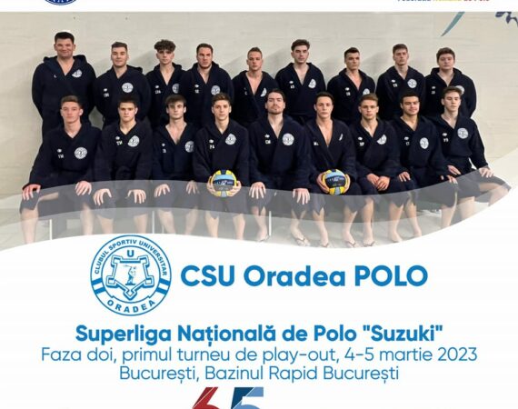 Superliga Națională de Polo "Suzuki", turneu I, grupa B (loc V-VIII). Iată rezultatele obținute CSU Oradea CS Politehnica Cluj-ACS Hello Sport CSU Oradea-CSU Oradea Sportul Studențesc- Componenții echipei 1. Abrudan Șerban2. Terean Sergiu3. Turculeț Daniel4. Chioveanu Mihnea5. Costa Maximilian6. Codilă Bogdan7. Dumitru Patrick8. Insinna Tommaso9. Cărăman Luca10. Szilágyi Erik11. Haşaş...