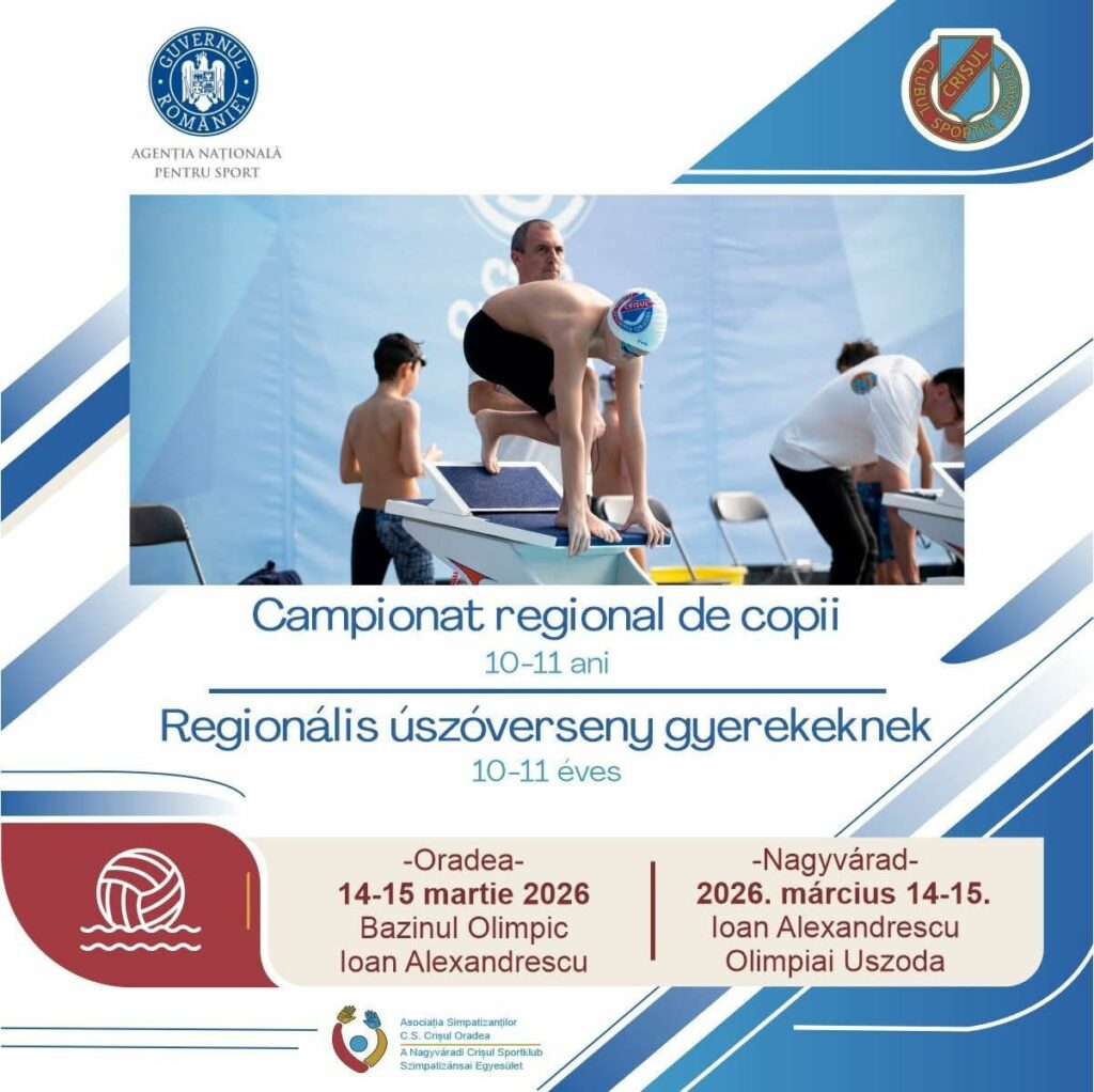 Regionális gyermek úszóversenyt a 10-11 éves korosztály számára, amelyen a Nagyváradi Crişul Sportklub sportolói is versenyezni fognak. A sportklubot Illés Zsolt