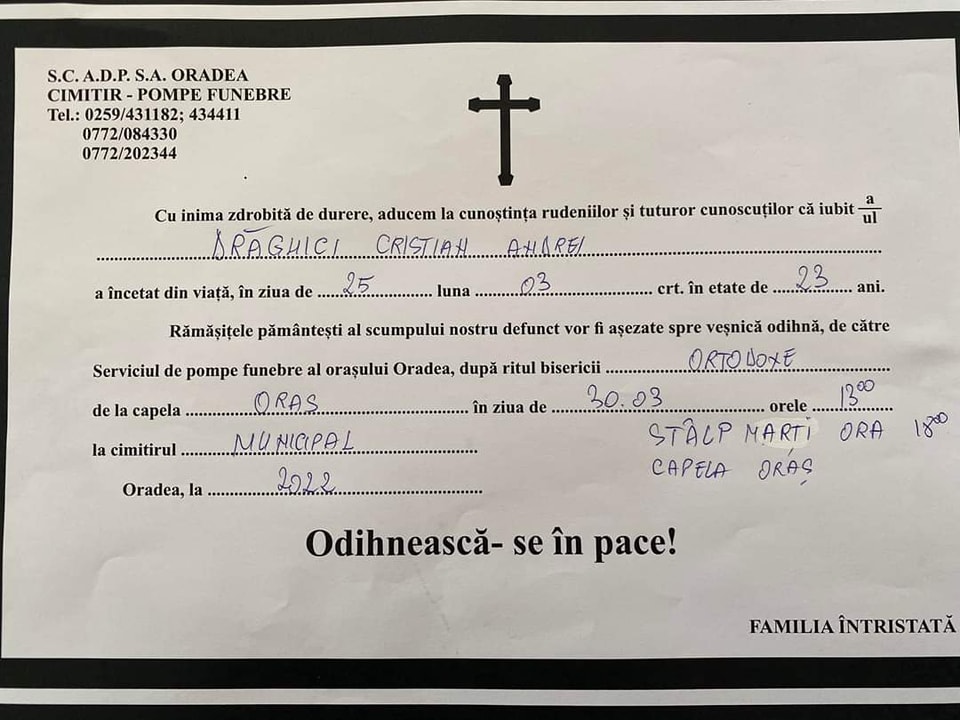 Cu durere în suflet ne luăm rămas bun de la Andrei Cristian Drăghici